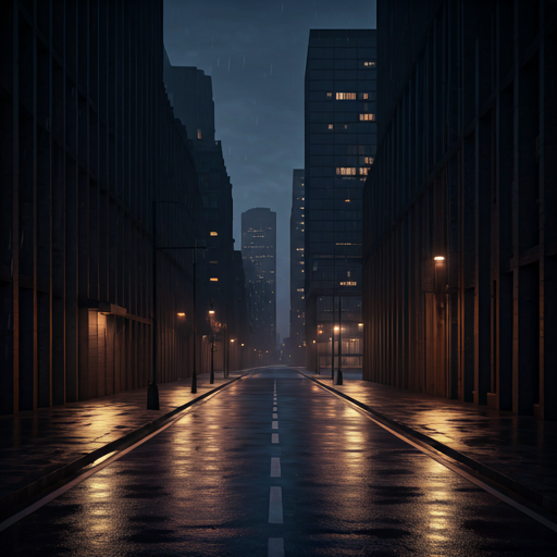 玻璃与霓虹中收束的现代都市氛围:钢的冷冽、沥青上的雨痕与不安夜晚的光斑。
